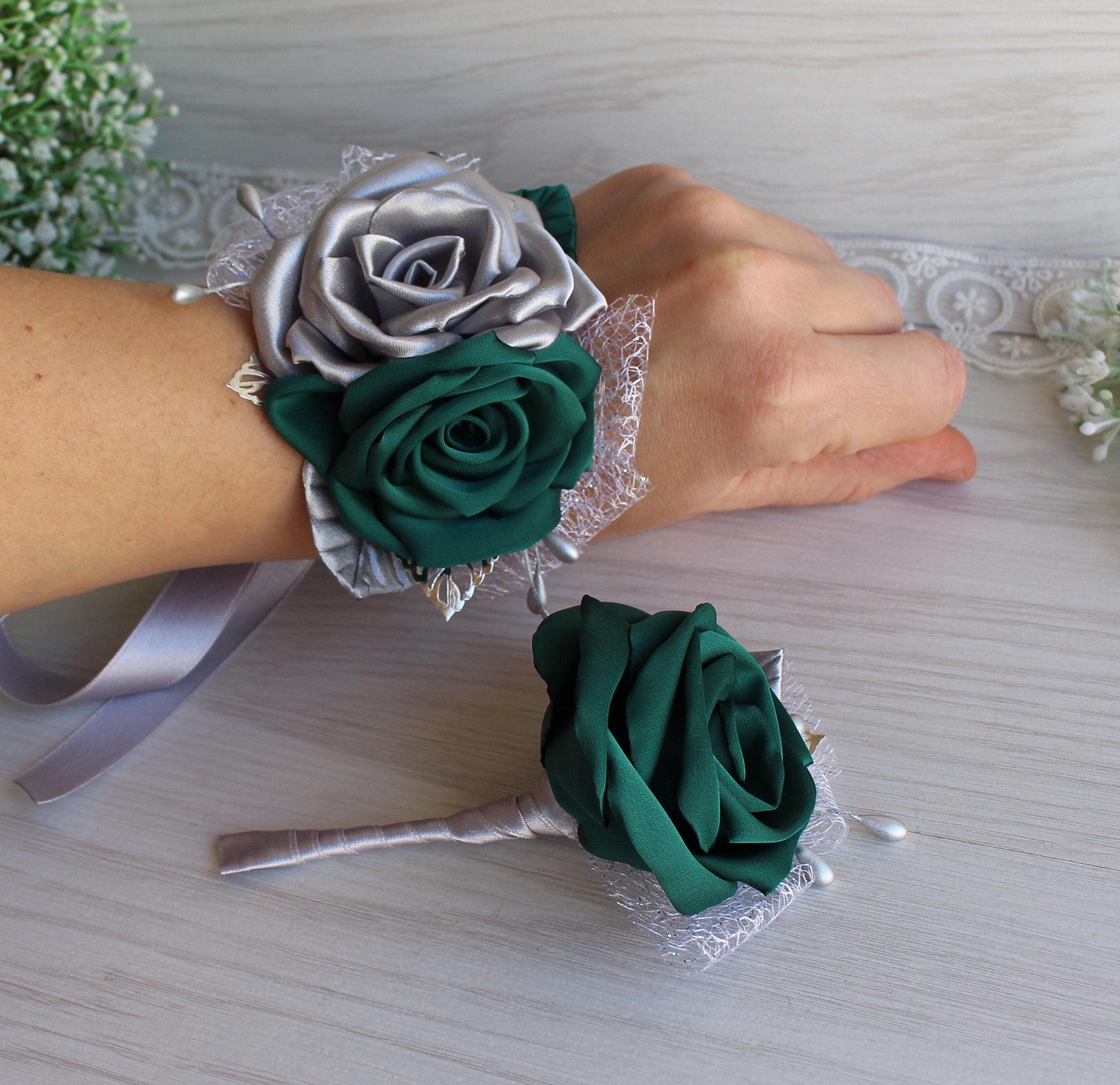 Emerald Green And Silver Wrist Corsage Or Boutonniere Set Etsy