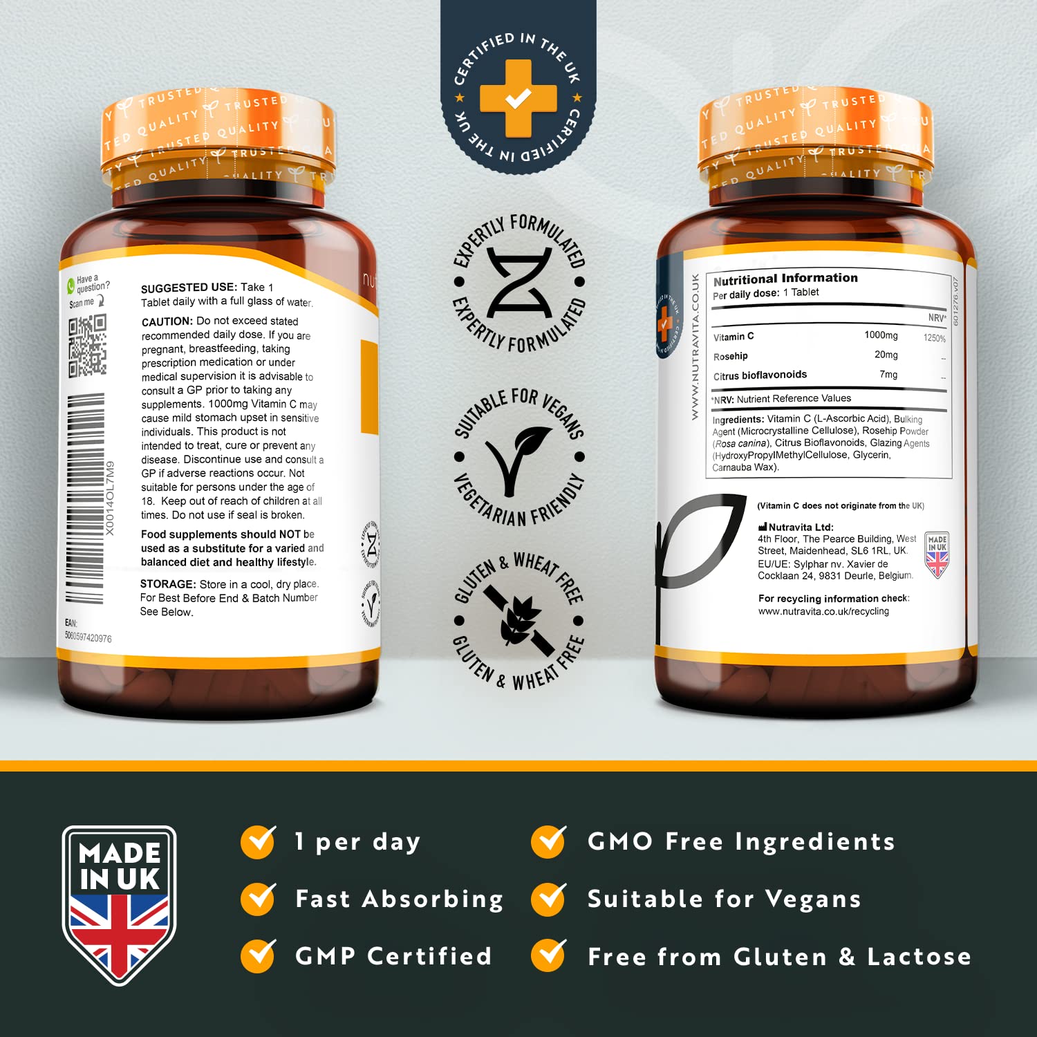 Vitamin C 1000mg 180 Premium Vegan Vegetarian Tablets 6 Month Supply High Strength Ascorbic Acid With Added Bioflavonoids Rosehip For Normal Immune System Made In The Uk By Nutravita Amazon Co Uk Health Personal Care