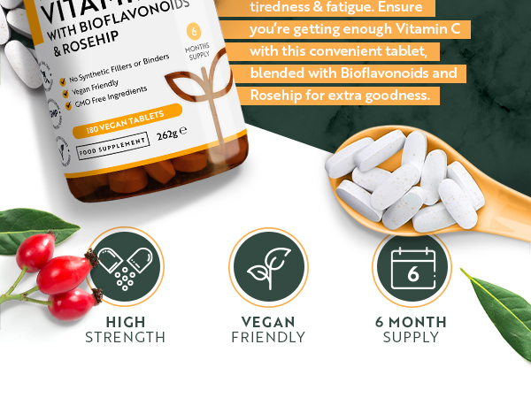 Vitamin C 1000mg 180 Premium Vegan Vegetarian Tablets 6 Month Supply High Strength Ascorbic Acid With Added Bioflavonoids Rosehip For Normal Immune System Made